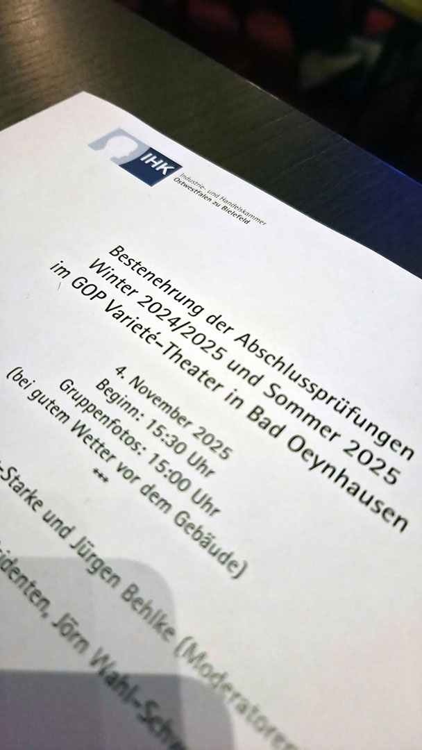 Bei der feierlichen IHK-Bestenehrung im GOP Varieté-Theater Bad Oeynhausen wurden sie für ihre Abschlussprüfungen mit der Note „sehr gut“ ausgezeichnet.