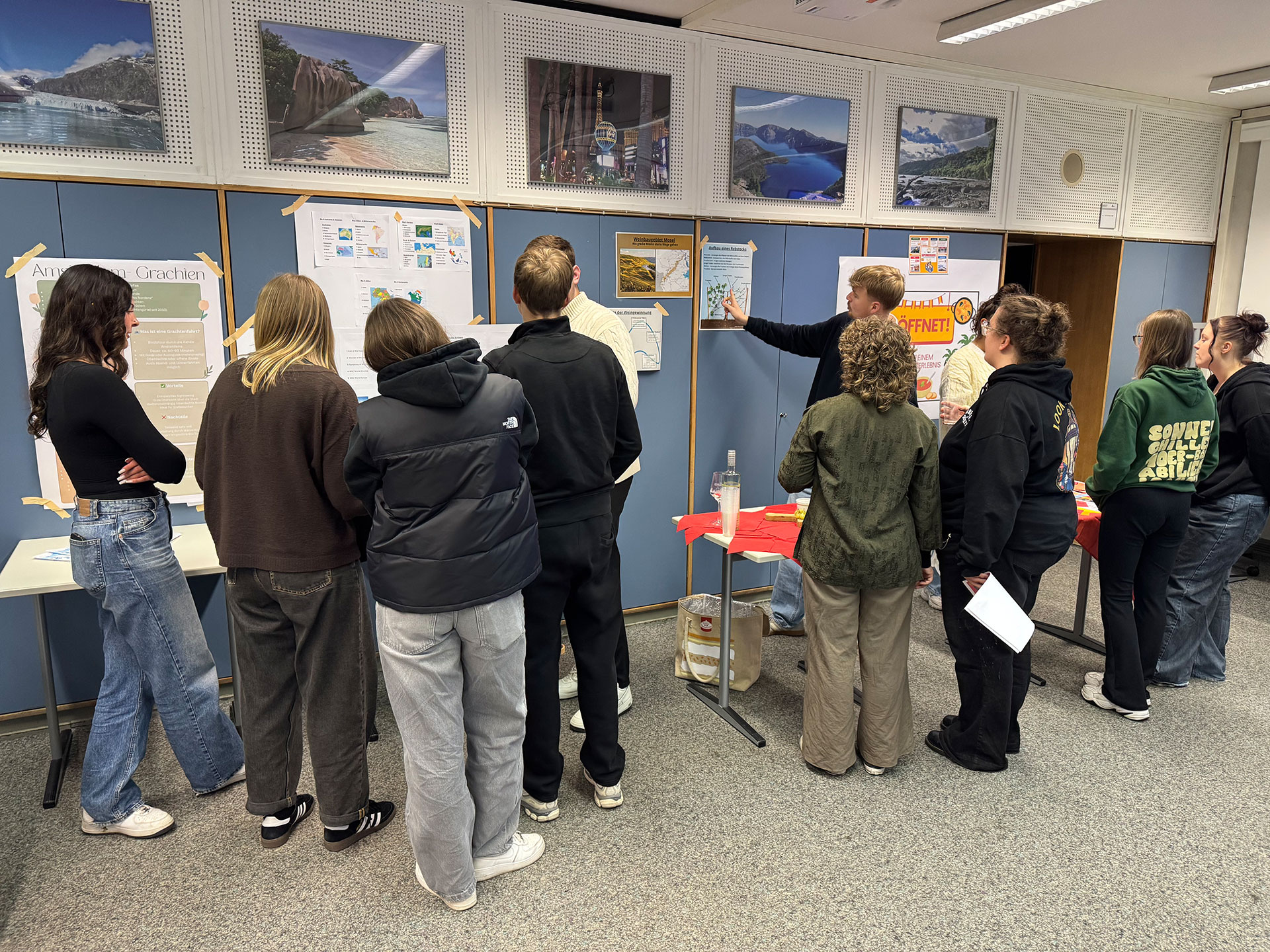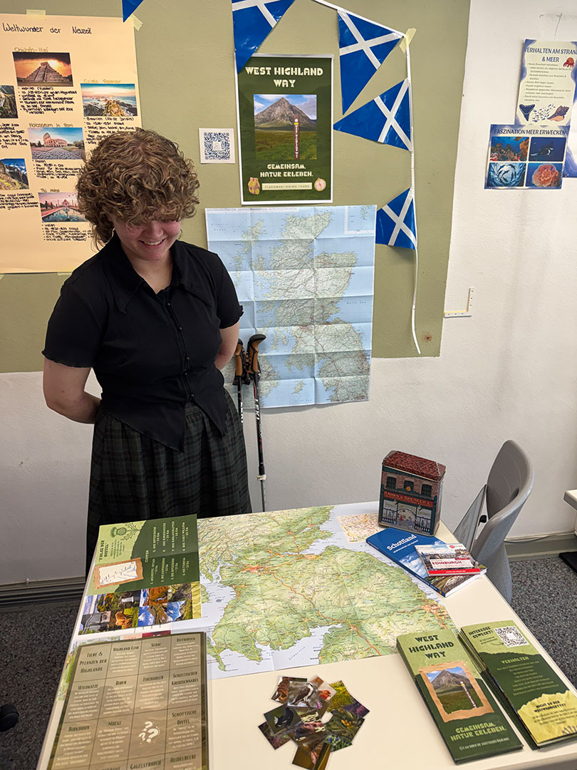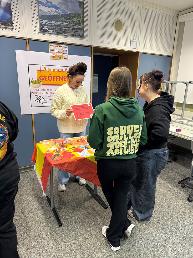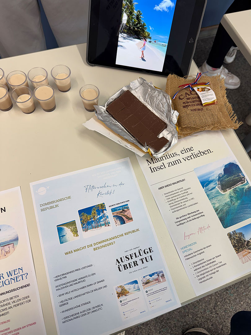 Für unsere angehenden Tourismuskaufleute wurde es gleich an zwei Terminen besonders lebendig: Die Mittelstufe organisierte im Rahmen des Differenzierungskurses Reiseverkehrsgeografie einen „Markt der Möglichkeiten“ und verwandelte den Klassenraum in eine vielfältige Informations- und Erlebniswelt rund um Tourismus und Geografie.